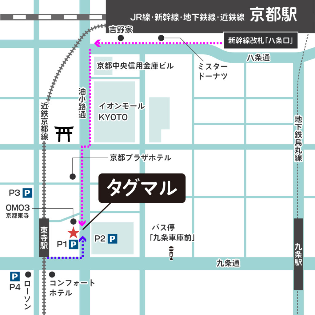 徒歩約10分 京都駅八条口出て右に進んで行くと右手にミスド、吉野家が見え、ガラス張りの京都信用金庫ビル側に渡って、大通りに沿って300mほど直進すると、イオンが左手にありそのまま進むと歩道橋がある交差点(油小路東寺道)につきます。ななめ右手京都プラザホテルの看板が見えるのでそちらに渡り直進、京都プラザホテル、OMO3京都東寺by星野リゾートを越えた先に当サロンがございます。